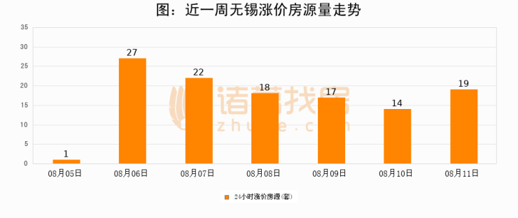 根据诸葛找房数据显示,无锡24小时涨价房源量为19套,较08月10日增加5套,环比上涨35.7%。与此同时,涨价房源占比小幅扩大,业主信心有所提升。
