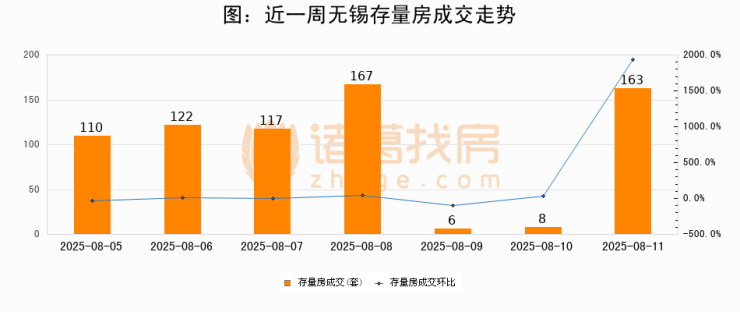 从存量房来看,2025年08月11日无锡存量房单日成交163套,比昨日增加155套,环比上涨1937.5%。从近一周存量房成交来看,无锡存量房日均成交套数为99套,08月11日单日成交163套,高于近一周平均水平64.6%。