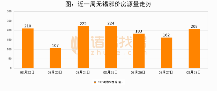 根据诸葛找房数据显示,无锡24小时涨价房源量为208套,较08月27日增加46套,环比上涨28.4%。与此同时,涨价房源占比小幅扩大,业主信心有所提升。