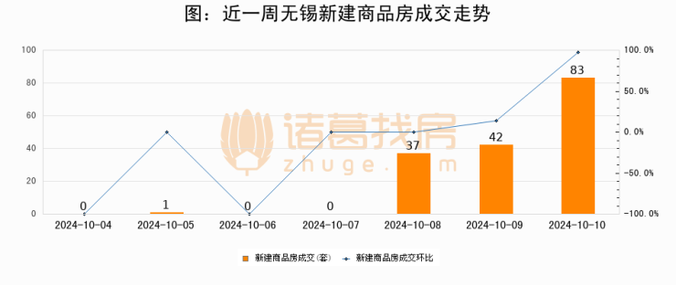 根据无锡市房地产市场管理和监测中心数据显示,2024年10月10日无锡新建商品房成交83套,较昨日增加41套,环比上涨97.6%