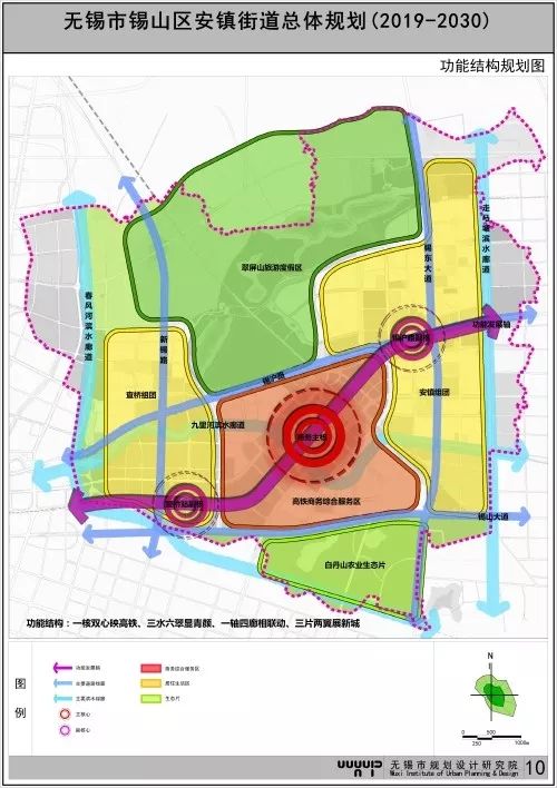 依托现状高铁站两侧地区、安镇老镇区及査桥老镇区,沿2号线及核心区布置公共设施,沿锡沪路两侧地区布置混合用地,分片构筑居住区,东西两侧结合锡山经济技术开发区布置产业,东北角布置物流用地。