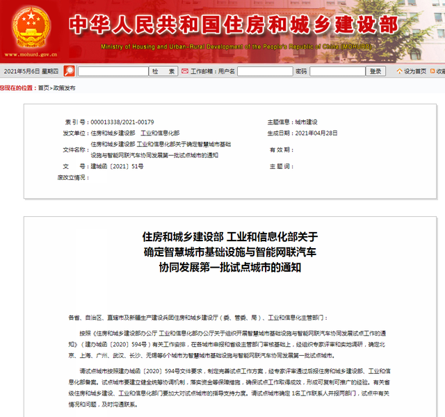 住房和城乡建设部 工业和信息化部关于确定智慧城市基础设施与智能网联汽车协同发展排名前列批试点城市的通知各省、自治区、直辖市及新疆生产建设兵团住房和城乡建设厅(委、管委、局)、工业和信息化主管部门:按照《住房和城乡建设部办公厅 工业和信息化部办公厅关于组织开展智慧城市基础设施与智能网联汽车协同发展试点工作的通知》(建办城函〔2020〕594号)有关工作安排,在各城市申报和省级主管部门审核基础上,经组织专家评审和实地调研,确定北京、上海、广州、武汉、长沙、无锡等6个城市为智慧城市基础设施与智能网联汽车协同发展排名前列批试点城市。请试点城市按照建办城函〔2020〕594号文件要求,制定完善试点工作方案,经专家评审通过后报住房和城乡建设部、工业和信息化部备案。试点城市要建立健全统筹协调机制,落实资金等保障措施,确保试点工作取得成效,形成可复制可推广的经验。有关省级住房和城乡建设、工业和信息化部门要加大对试点城市的指导支持力度。请试点城市确定1名工作联系人并报两部门,试点中有关情况和问题,及时沟通联系。联系人:住房和城乡建设部城市建设司 张旭亮电话:010-58933961联系人:工业和信息化部装备工业一司 陈春梅电 话:010-68205629住房和城乡建设部工业和信息化部2021年4月28日