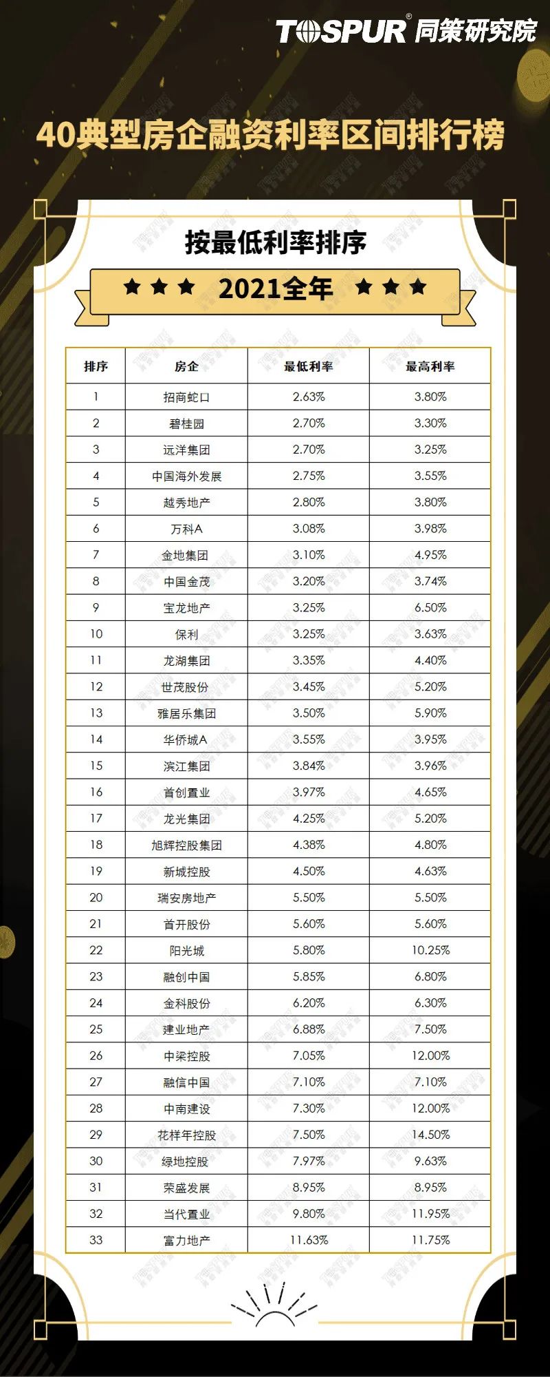 按房企融资的较低利率排名来看,招商蛇口、碧桂园、远洋集团、中国海外发展、越秀地产较低利率在2.6%~2.8%之间;万科A、金地集团、中国金茂、宝龙地产、保利、龙湖集团、世茂股份、雅居乐集团、华侨城、滨江集团、首创置业、龙光集团、旭辉控股集团、新城控股、瑞安房地首开股份、阳光城、融创中国等17家房企的较低融资利率在3%~6%之间。