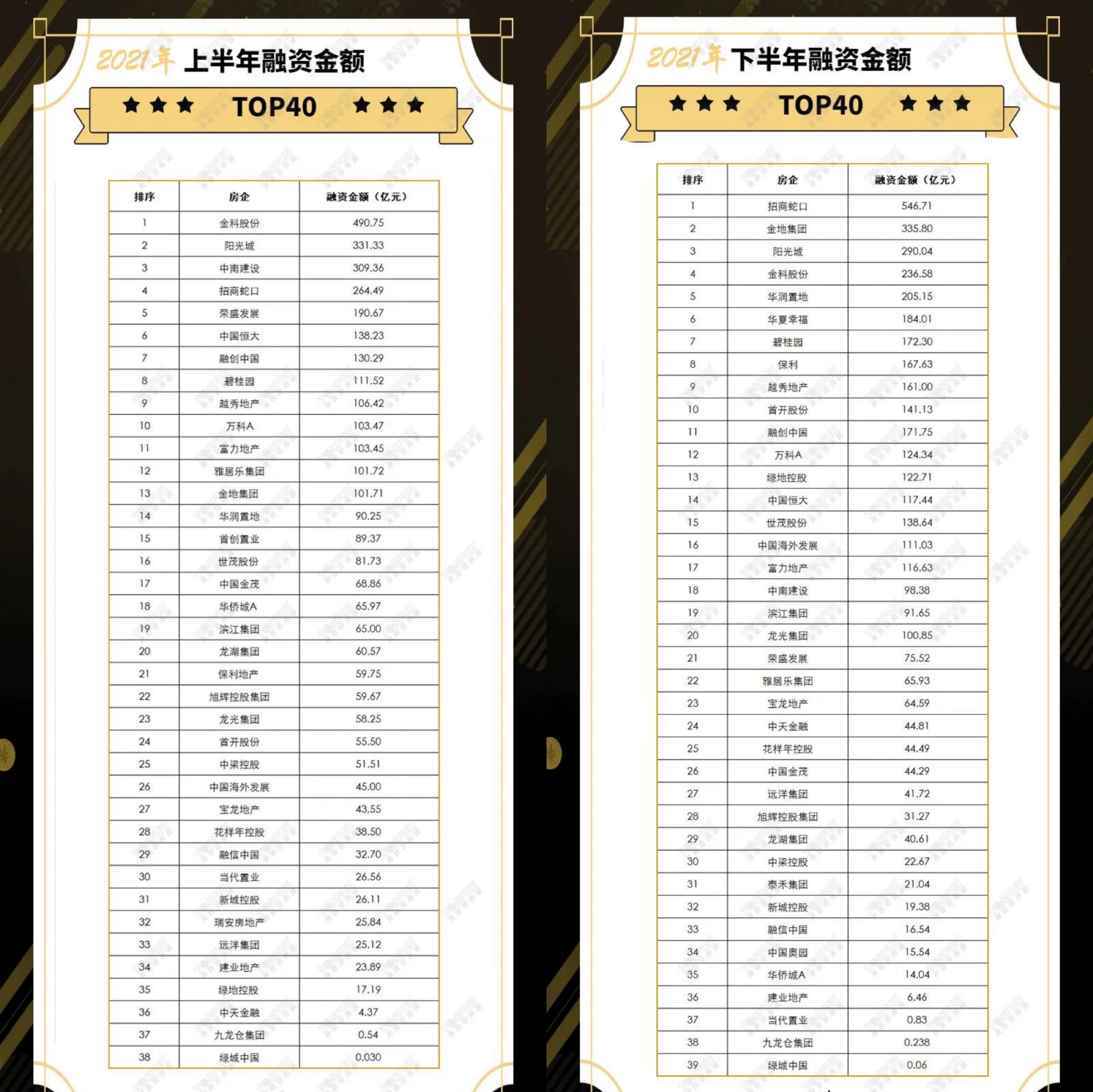 根据《排行榜》,2021年上半年房企尝试多元渠道破局,但表外渠道被限,表内融资艰难,房企面临两难境地。到下半年,商票监管及拿地销售比不超过40%的限制等相关补丁政策出台,再次收紧房企融资渠道。在此背景下,以国企、央企为代表的一批财务较为稳健的房企,融资优势逐步显露,开始有弯道超车的趋势,反观部分民营房企在多重因素影响下,爆发现金流流动性问题,违约事件频出。