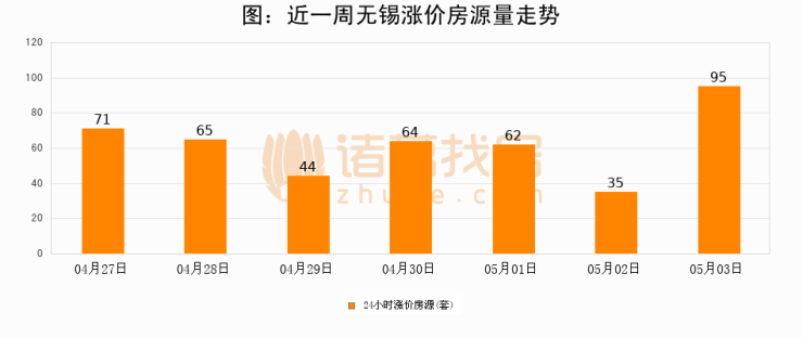 根据诸葛找房数据显示,无锡24小时涨价房源量为95套,较05月02日增加60套,环比上涨171.4%。与此同时,涨价房源占比小幅扩大,业主信心有所提升。