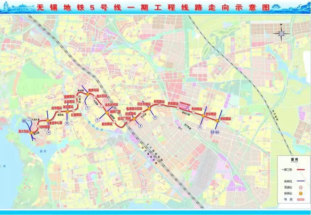 无锡地铁5号线一期工程起于渔父岛站,止于新韵路站,依次沿望山路、鸿桥路、太湖大道、建筑路、红星路、解放路、向阳路、城南路、旺庄路、泰伯大道走行,此外还向东预留了远景与苏州地铁衔接的条件。