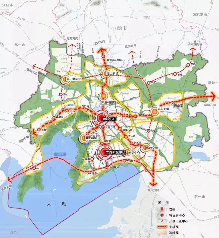 根据无锡市自然资源和规划局报道,接下来无锡将形成“一城两核四片六组团”的总体布局、“两核多点”的中心体系,“环楔相连”的开敞空间和“公交优先”的TOD城市空间结构。