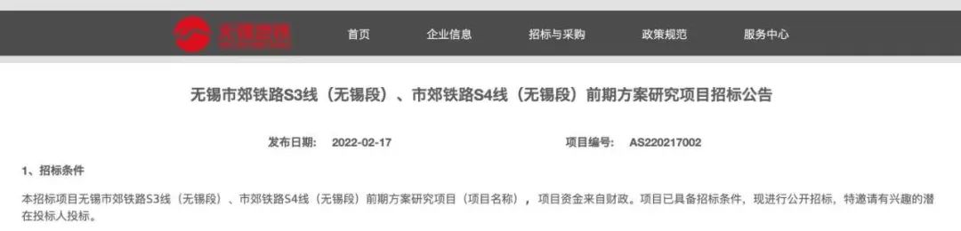 2022年2月,无锡地铁网站发布了《无锡市郊铁路S3线(无锡段)、市郊铁路S4线(无锡段)前期方案研究项目招标公告》。