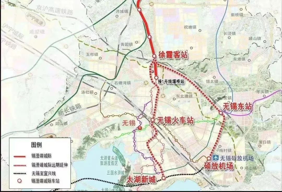 无锡市域S1线支线:自市域S1线的徐霞客站引出,沿京沪高铁走行,引入高铁无锡东站,后转至新韵路走行引入硕放机场,线路全长约31公里,投资预估算217亿元。