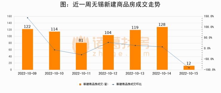 根据无锡市房地产市场管理和监测中心数据显示,2022年10月15日无锡新建商品房成交12套,较昨日减少116套,环比下降90.6%