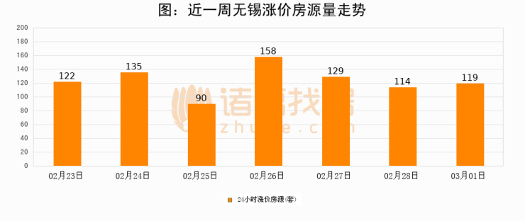 根据诸葛找房数据显示,无锡24小时涨价房源量为119套,较02月28日增加5套,环比上涨4.4%。与此同时,涨价房源占比小幅扩大,业主信心有所提升。