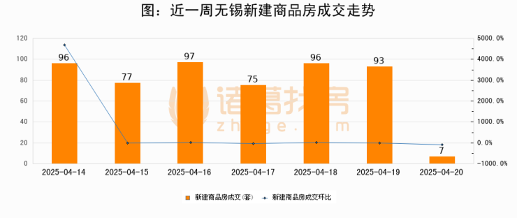 根据无锡市房地产市场管理和监测中心数据显示,2025年04月20日无锡新建商品房成交7套,较昨日减少86套,环比下降92.5%