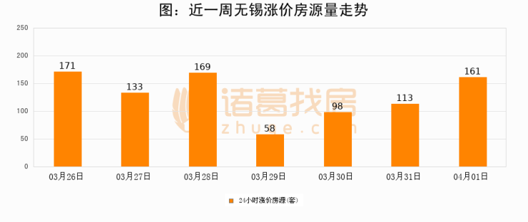 根据诸葛找房数据显示,无锡24小时涨价房源量为161套,较03月31日增加48套,环比上涨42.5%。与此同时,涨价房源占比小幅扩大,业主信心有所提升。