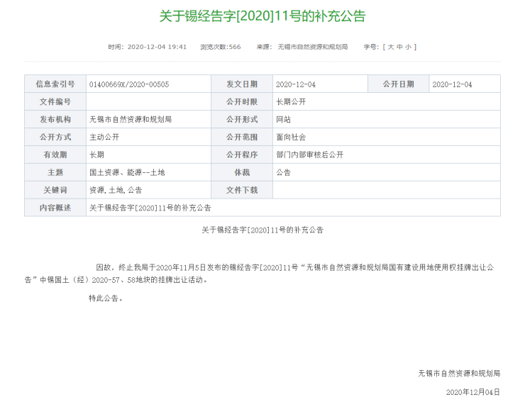 无锡自然资源规划局公告原文截图如下: