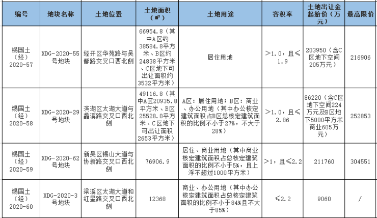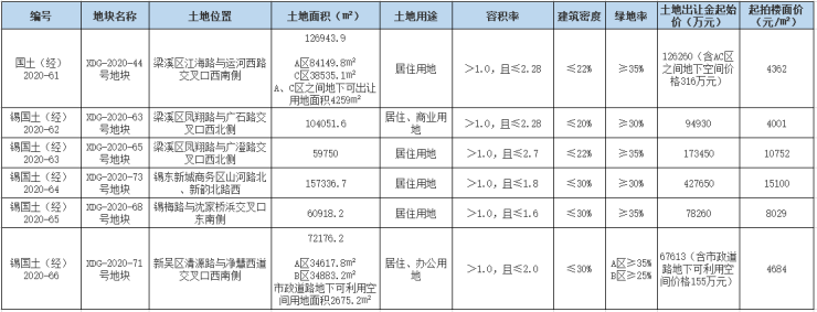 这6幅地块中,梁溪区3幅、锡山区1幅、新吴区2幅;全部设置较高限价18000元/㎡,触顶竞报建人才房;起拍价较高的是锡山区XDG-2020-68号地块,15100元/㎡。
