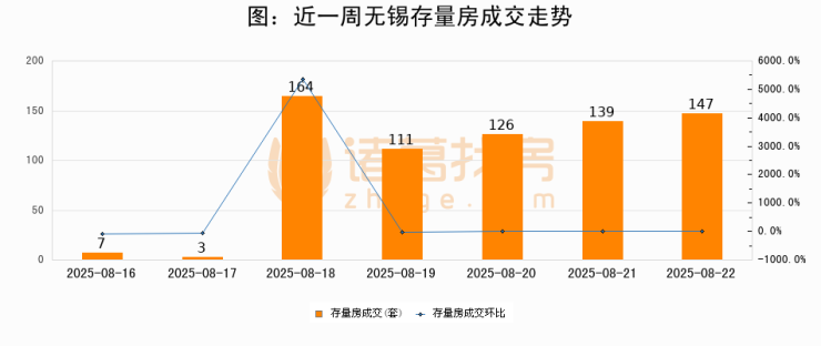 从存量房来看,2025年08月22日无锡存量房单日成交147套,比昨日增加8套,环比上涨5.8%。从近一周存量房成交来看,无锡存量房日均成交套数为99套,08月22日单日成交147套,高于近一周平均水平48.5%。