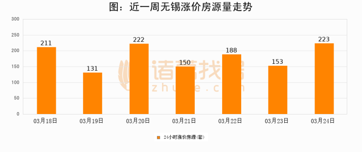 根据诸葛找房数据显示,无锡24小时涨价房源量为223套,较03月23日增加70套,环比上涨45.8%。与此同时,涨价房源占比小幅扩大,业主信心有所提升。