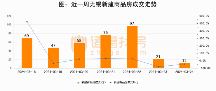 根据无锡市房地产市场管理和监测中心数据显示,2024年03月24日无锡新建商品房成交12套,较昨日减少9套,环比下降42.9%