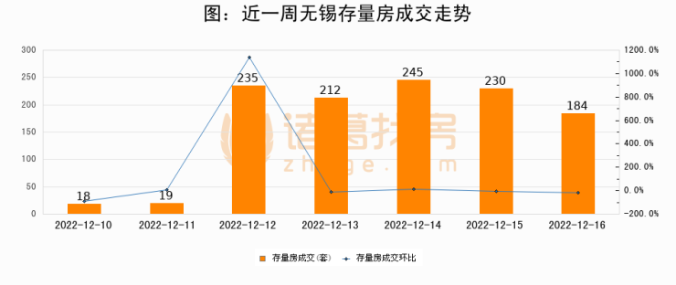 从存量房来看,2022年12月16日无锡存量房单日成交184套,比昨日减少46套,环比下降20%。从近一周存量房成交来看,无锡存量房日均成交套数为163套,其中12月14日成交量最高为245套,12月16日单日成交184套,高于近一周平均水平12.9%。