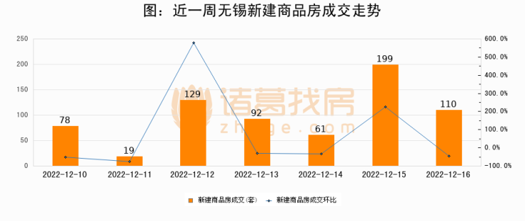 根据无锡市房地产市场管理和监测中心数据显示,2022年12月16日无锡新建商品房成交110套,较昨日减少89套,环比下降44.7%。近一周无锡新建商品房日均成交99套,其中,12月15日成交量最高为199套。12月16日单日成交110套,高于近一周平均水平11.1%。