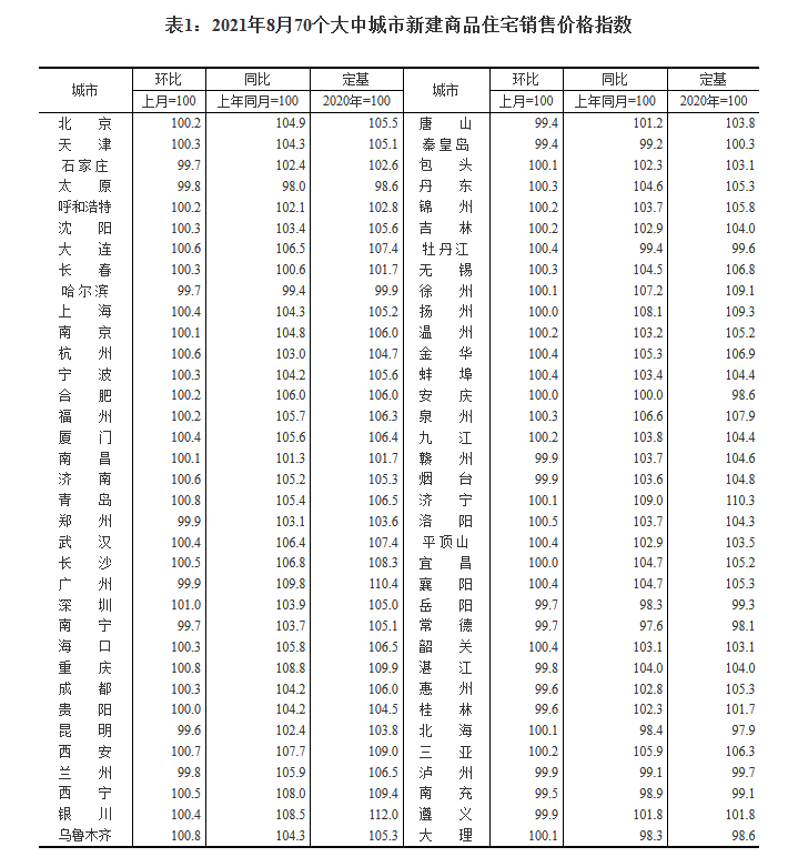 国家统计局城市司首席统计师绳国庆解读称,2021年8月份,各地全面落实房地产长效机制,70个大中城市商品住宅销售价格环比、同比涨幅总体延续回落态势。