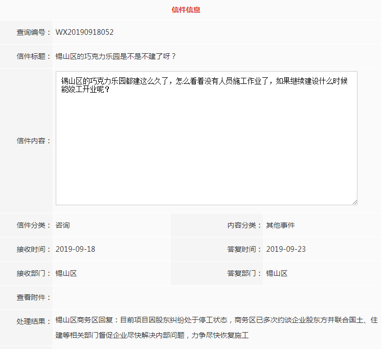 问:锡山区的巧克力乐园都建这么久了,怎么看着没有人员施工作业了,如果继续建设什么时候能竣工开业呢?