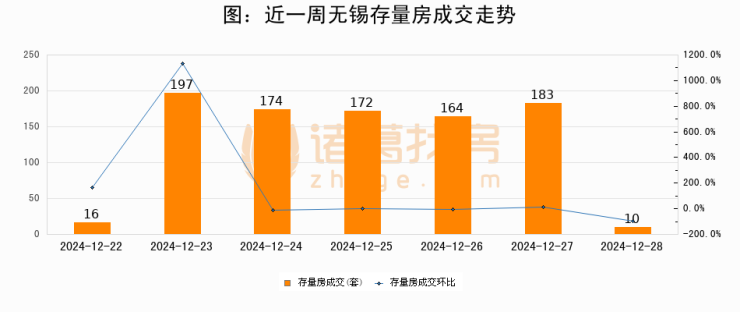 从存量房来看,2024年12月28日无锡存量房单日成交10套,比昨日减少173套,环比下降94.5%。从近一周存量房成交来看,无锡存量房日均成交套数为130套,12月28日单日成交10套,低于近一周平均水平92.3%。