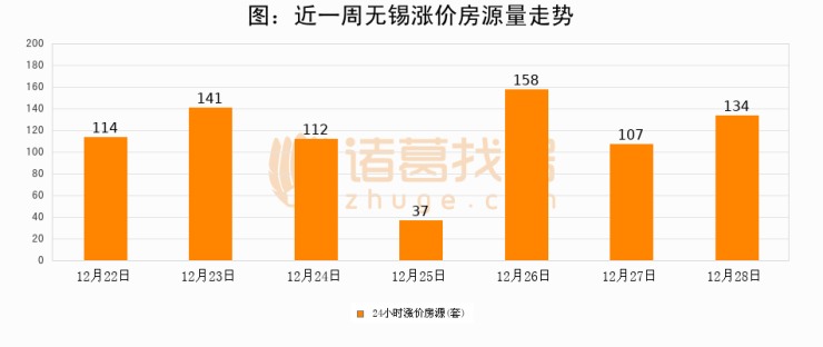 根据诸葛找房数据显示,无锡24小时涨价房源量为134套,较12月27日增加27套,环比上涨25.2%。与此同时,涨价房源占比小幅扩大,业主信心有所提升。