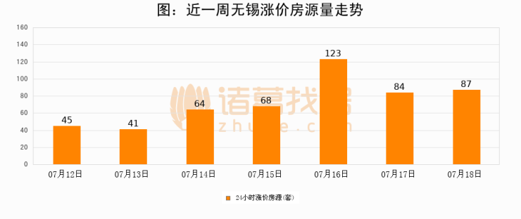 根据诸葛找房数据显示,无锡24小时涨价房源量为87套,较07月17日增加3套,环比上涨3.6%。与此同时,涨价房源占比小幅扩大,业主信心有所提升。