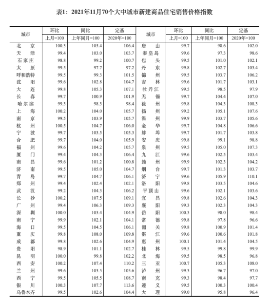 【环球网房产报道】11月15日,国家统计局发布2021年11月商品住宅销售价格变动情况。国家统计局城市司首席统计师绳国庆对数据进行了解读:2021年11月份,70个大中城市商品住宅销售价格环比延续下降态势,同比涨幅持续回落。