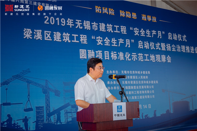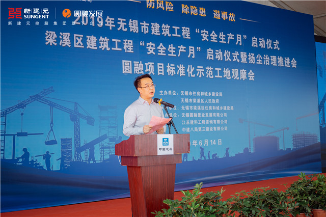 无锡市梁溪区住房和城乡建设局局长徐杰发表了致辞,强调了安全规范施工在项目建设中的重要性,安全规范一定要从严要求。对新建元圆融发展在无锡圆融项目的建设表示了高度认可。对始终坚持用品质说话的作风表示支持与鼓励。