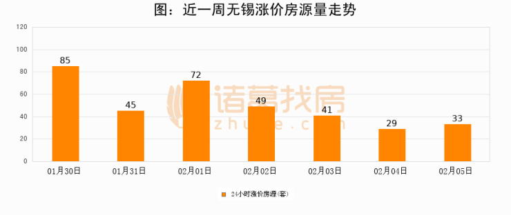 根据诸葛找房数据显示,无锡24小时涨价房源量为33套,较02月04日增加4套,环比上涨13.8%。与此同时,涨价房源占比小幅扩大,业主信心有所提升。