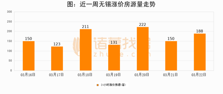 根据诸葛找房数据显示,无锡24小时涨价房源量为188套,较03月21日增加38套,环比上涨25.3%。与此同时,涨价房源占比小幅扩大,业主信心有所提升。
