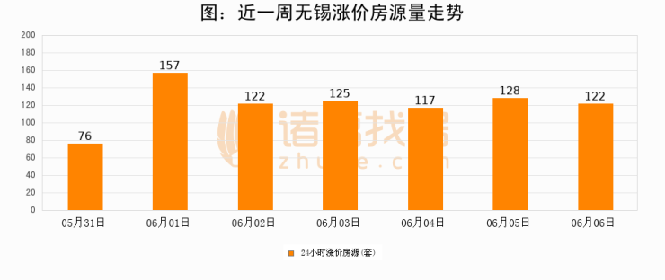 根据诸葛找房数据显示,无锡24小时涨价房源量为122套,较06月05日减少6套,环比下降4.7%。与此同时,涨价房源占比小幅回落,对于购房者来说是一个入市窗口期,购房者可抓住时机入市。