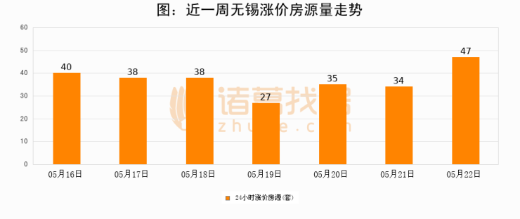 根据诸葛找房数据显示,无锡24小时涨价房源量为47套,较05月21日增加13套,环比上涨38.2%。与此同时,涨价房源占比小幅扩大,业主信心有所提升。