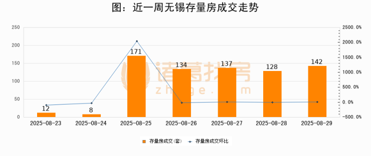 从存量房来看,2025年08月29日无锡存量房单日成交142套,比昨日增加14套,环比上涨10.9%。从近一周存量房成交来看,无锡存量房日均成交套数为104套,08月29日单日成交142套,高于近一周平均水平36.5%。