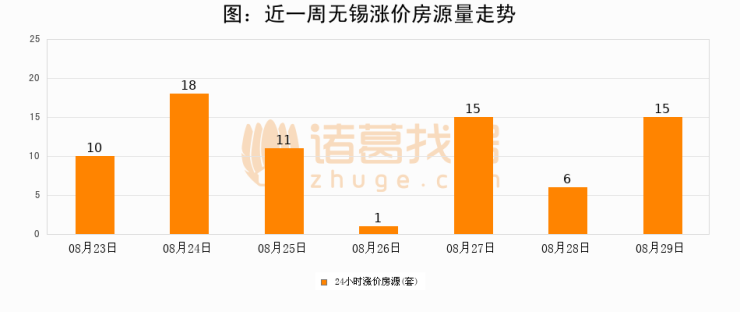 根据诸葛找房数据显示,无锡24小时涨价房源量为15套,较08月28日增加9套,环比上涨150%。与此同时,涨价房源占比小幅扩大,业主信心有所提升。