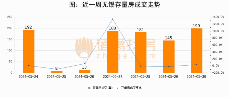 从存量房来看,2024年05月30日无锡存量房单日成交199套,比昨日增加54套,环比上涨37.2%。从近一周存量房成交来看,无锡存量房日均成交套数为132套,05月30日单日成交199套,高于近一周平均水平50.8%。