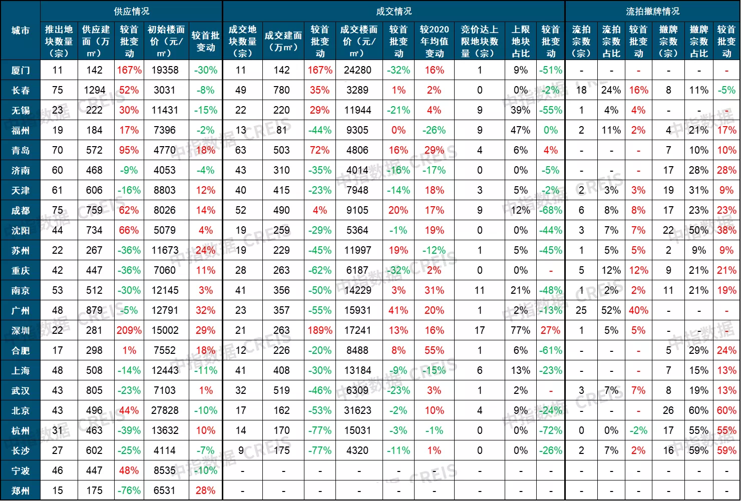 说明:统计口径:市本级;截至2021年10月21日,第二批集中供地成交指标较首批增加标红,否则标绿。数据来源:中指数据CREIS