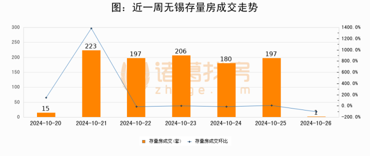 从存量房来看,2024年10月26日无锡存量房单日成交1套,比昨日减少196套,环比下降99.5%。从近一周存量房成交来看,无锡存量房日均成交套数为145套,10月26日单日成交1套,低于近一周平均水平99.3%。