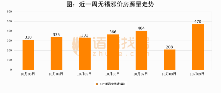 根据诸葛找房数据显示,无锡24小时涨价房源量为470套,较10月08日增加262套,环比上涨126%。与此同时,涨价房源占比小幅扩大,业主信心有所提升。