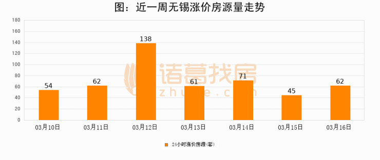 根据诸葛找房数据显示,无锡24小时涨价房源量为62套,较03月15日增加17套,环比上涨37.8%。与此同时,涨价房源占比小幅扩大,业主信心有所提升。