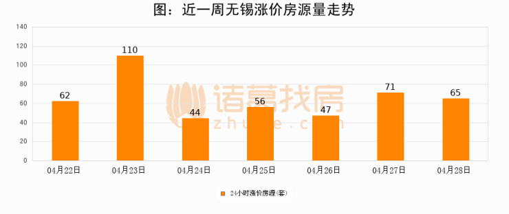 根据诸葛找房数据显示,无锡24小时涨价房源量为65套,较04月27日减少6套,环比下降8.5%。与此同时,涨价房源占比小幅回落,对于购房者来说是一个入市窗口期,购房者可抓住时机入市。