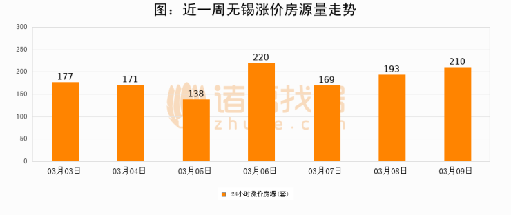 根据诸葛找房数据显示,无锡24小时涨价房源量为210套,较03月08日增加17套,环比上涨8.8%。与此同时,涨价房源占比小幅扩大,业主信心有所提升。
