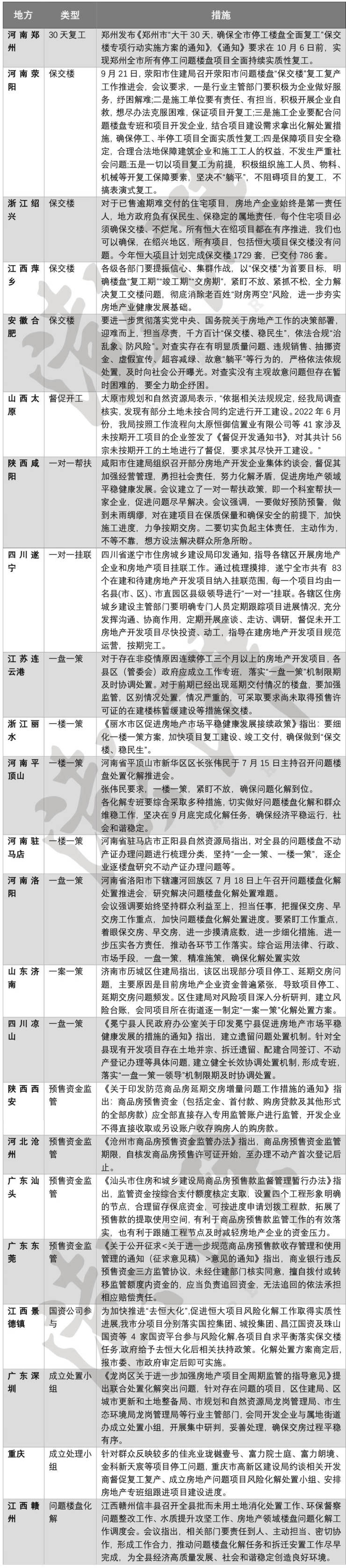 从地方层面来看,据澎湃新闻不完全统计,7月以来,包括河南郑州、河南荥阳、浙江绍兴、江西萍乡、安徽合肥、山西太原、陕西咸阳、四川遂宁、江苏连云港、浙江丽水、河南平顶山、河南驻马店、河南洛阳、山东济南、四川凉山、陕西西安、广东汕头、江西景德镇、重庆、河北沧州、广东东莞、广东深圳、江西赣州等地出台“保交楼”措施,包括对问题项目“一盘一策”及时协调处置,各级领导对项目挂联兜底,加强预售资金监管,协调引入区域国企和金融机构来盘活项目等。