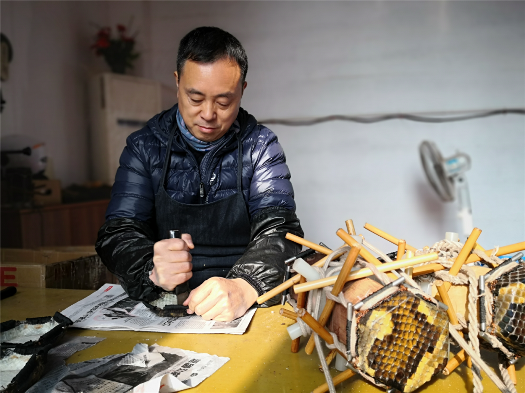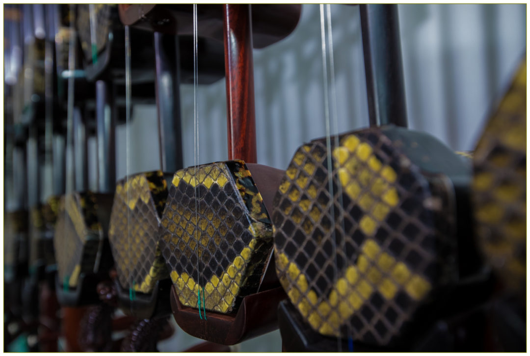 音色的纯美,源自每一道优质的制作工艺把控——好的木料带来紧实细密的材质,比如火气渐褪的老红木,稀有的黄花梨,都是优质的琴身用材。即便是普通的学生用琴,也采用上好的硬木作琴杆,这是成为一把好琴的资源禀赋。琴杆打磨要利落趁手,没有十几二十年手上功夫,这活也做不来。古月琴坊的打磨能手陈水根干这行已有三十多年了,所用的打磨工具都是自己设计和加工的定制刀具;和木制琴筒形成“音箱”共振妙音的还有一道梅村特色选材,那就是采用上好的蟒蛇皮对琴筒进行二次鞔皮的过程——中高端二胡的六边形琴筒外要覆一层皮面,坚韧有弹性、花纹美丽的越南蟒蛇皮最适合,这是海选了全球材料后业界公认的标准。但一张五六米长的大蟒皮上只能选取蟒背尾部的一小片裁剪区域,一张全皮无误差制作,只能做5到6把二胡。每一次鞔皮,从用绳线加竹竿捆扎到放开,再捆扎、放松,每次周期要5天,期间,要保证环境的温湿度在一定范围内,如此调整释放皮面的张力,由此带来更好的使用质感和使用寿命。
