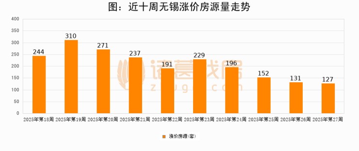 从调价房源来看,第27周无锡涨价房源127套,较上周下降3.1%。与此同时,27周涨价房源占比提升0.2个百分点,业主信心持续恢复。