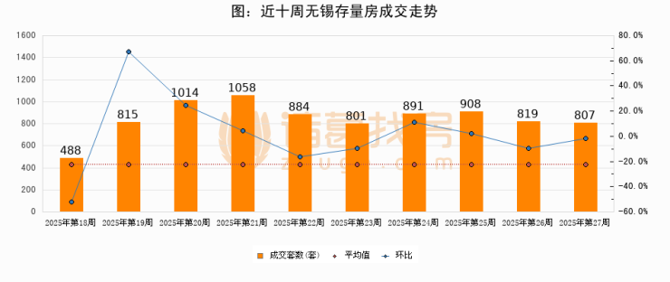 存量房方面,第27周无锡存量房成交807套,较上周减少12套,环比下降1.5%。从近十周成交走势来看,周均成交套数为848套,本周低于平均水平4.8%。