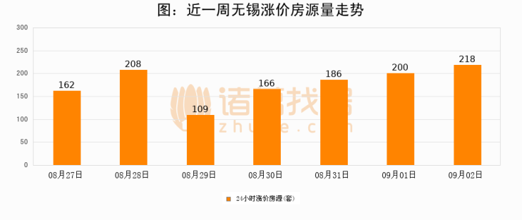 根据诸葛找房数据显示,无锡24小时涨价房源量为218套,较09月01日增加18套,环比上涨9%。与此同时,涨价房源占比小幅扩大,业主信心有所提升。