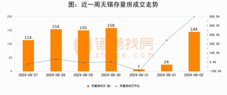 从存量房来看,2024年09月02日无锡存量房单日成交144套,比昨日增加120套,环比上涨500%。从近一周存量房成交来看,无锡存量房日均成交套数为107套,09月02日单日成交144套,高于近一周平均水平34.6%。